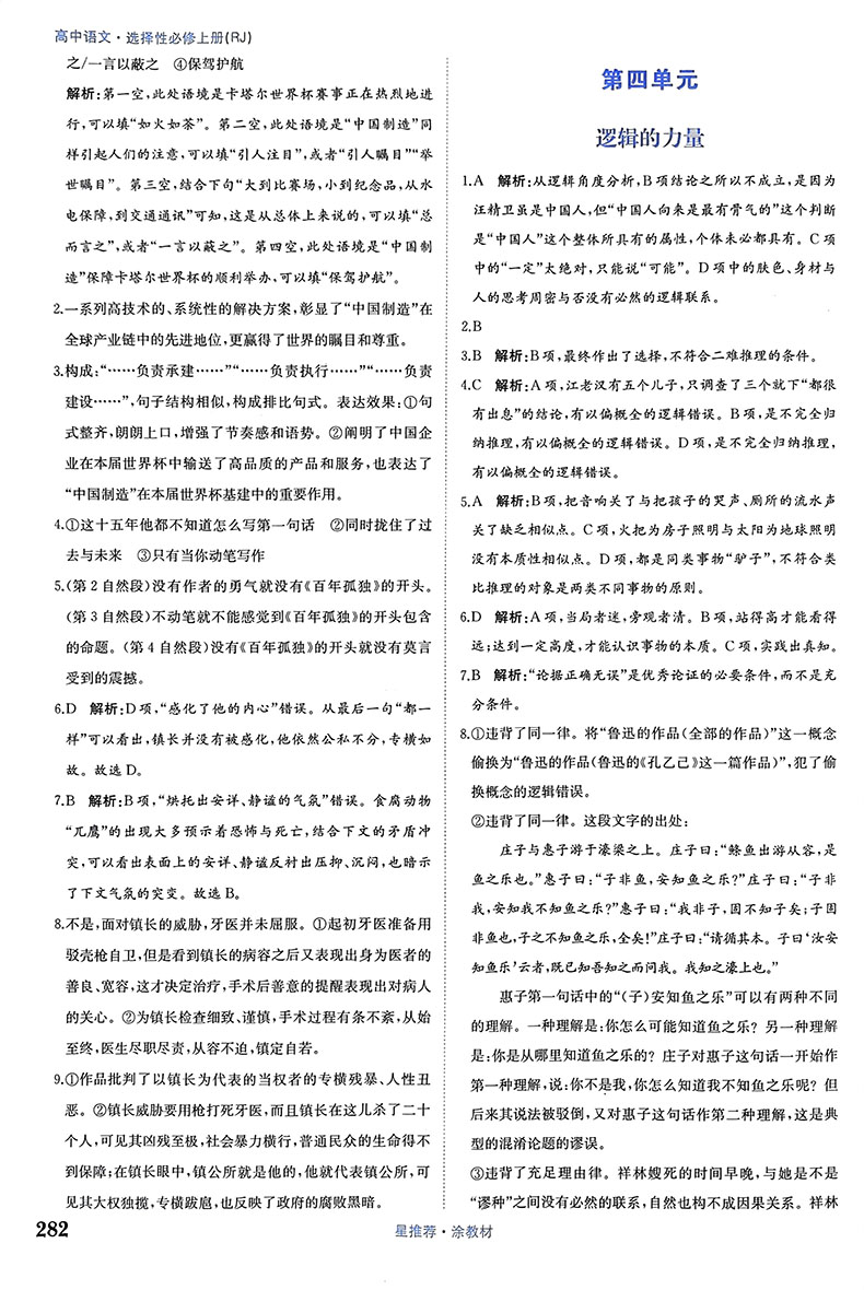 涂教材高中语文选择性必修上册 人教版 2024版