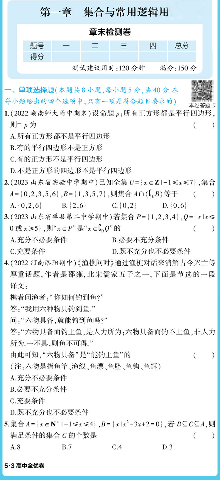 2024版53高中全优卷 数学必修第一册 人教B版 曲一线