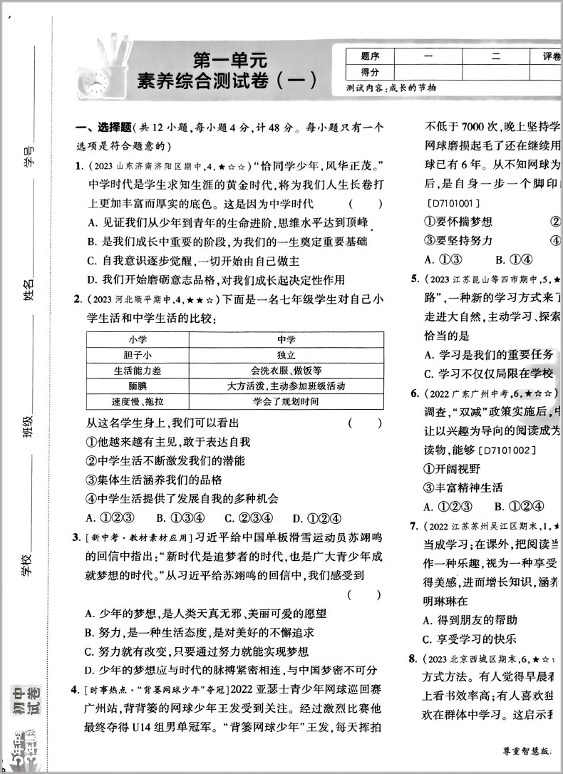 2024版 五年中考三年模拟 七年级上册道德与法治 人教版