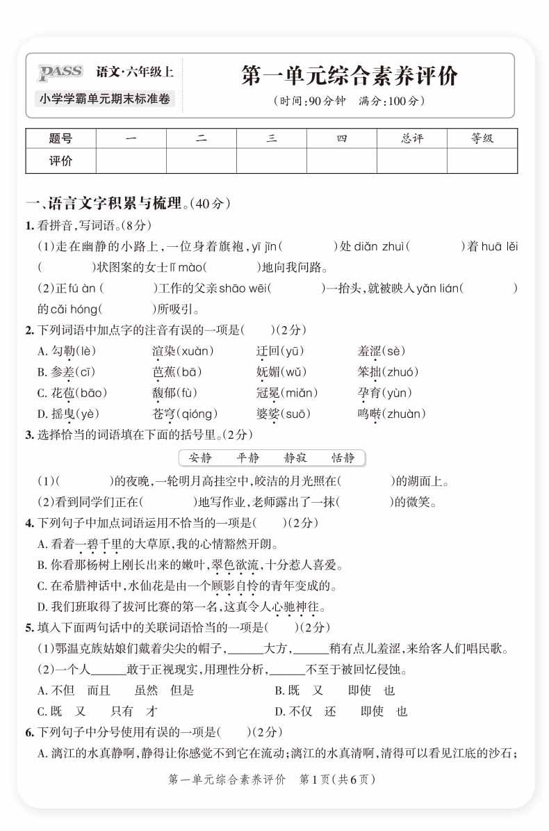 2023秋小学学霸单元期末标准卷六年级上册语文 人教版 绿卡图书