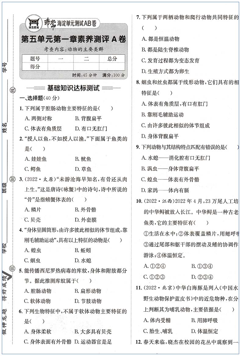 首页> 初中教辅> 八年级> 生物> 2024版非常海淀单元测试AB卷 八年级上册生物 人教版