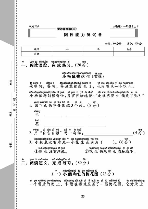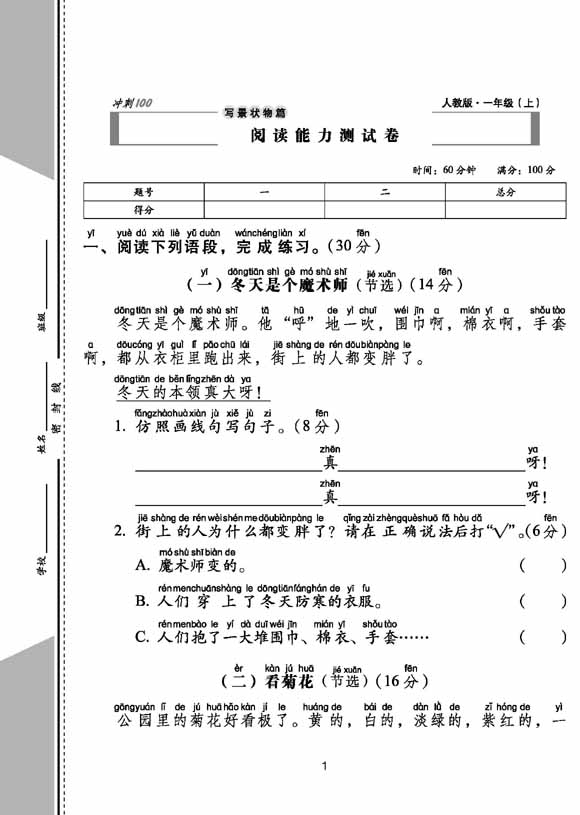 期末冲刺100分 小学语文课内外阅读训练一年级 上册