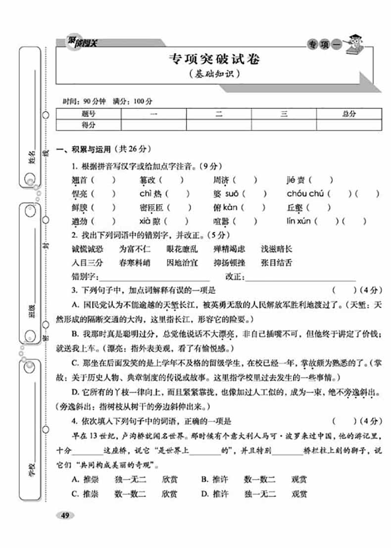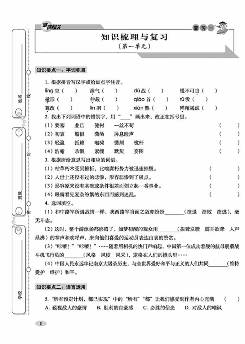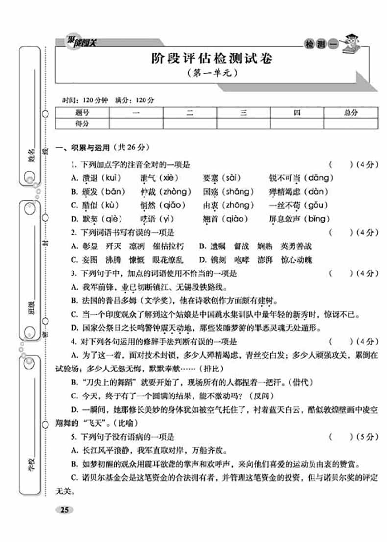 聚能闯关100分期末复习冲刺卷语文八年级上册 23秋人教版