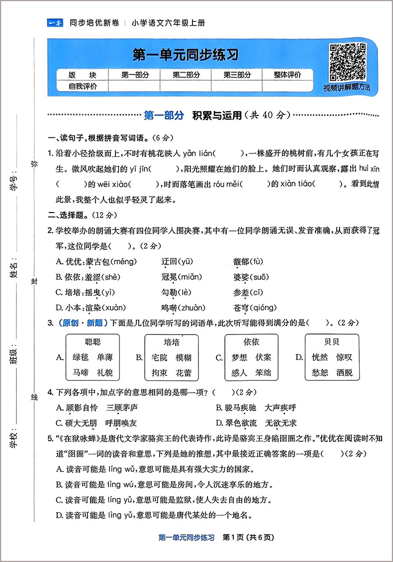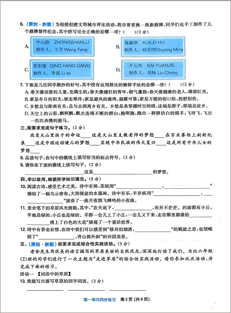 24一本小学同步培优新卷六年级语文上