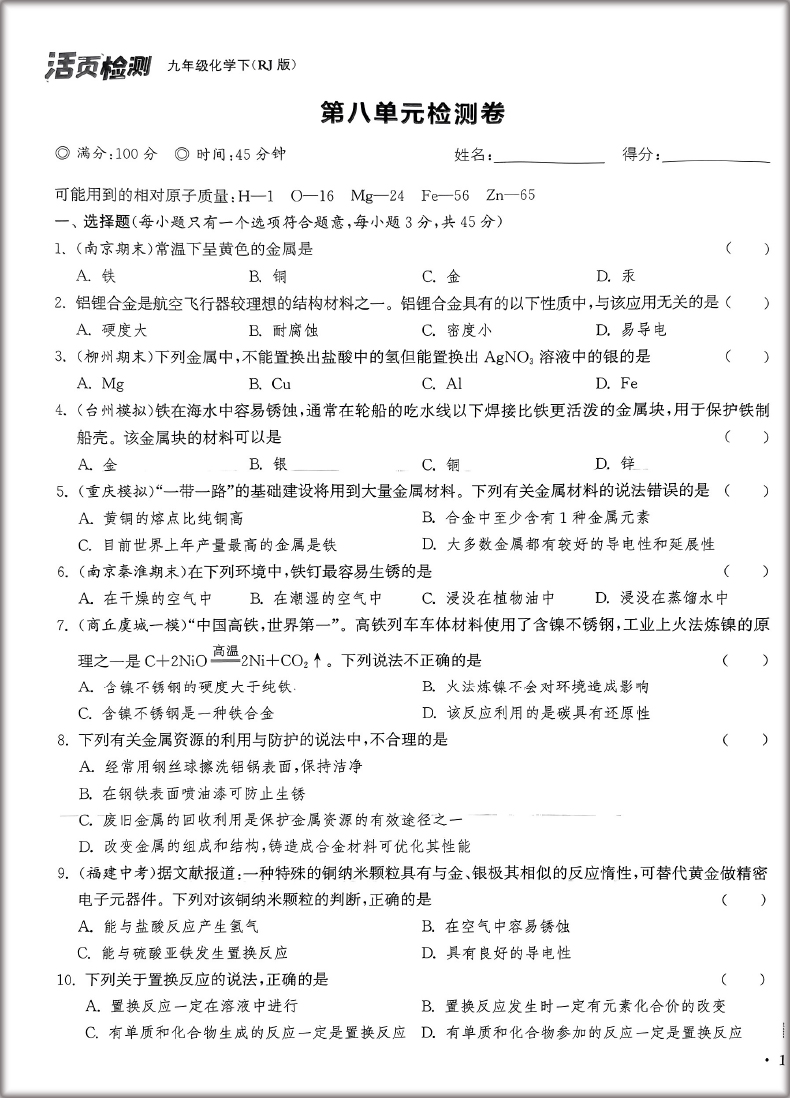 首页> 初中教辅> 九年级> 化学> 24活页检测九年化学下