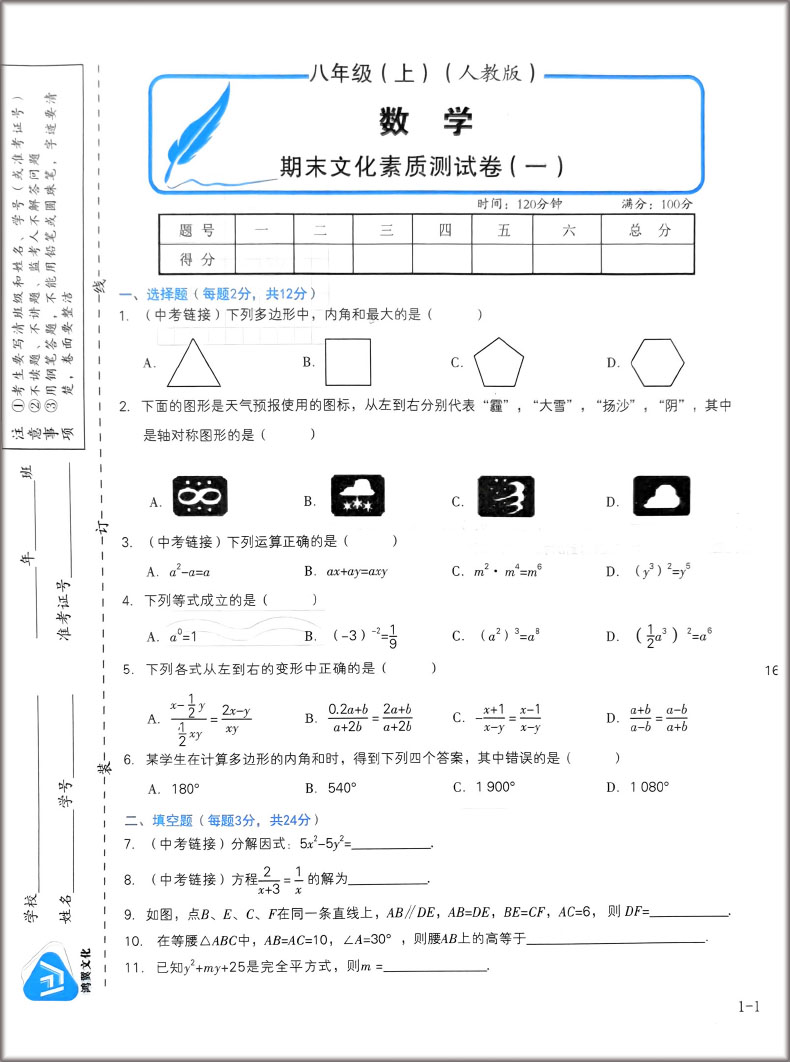 首页> 初中教辅> 八年级> 数学> 24完美期末一遍过八年数学上