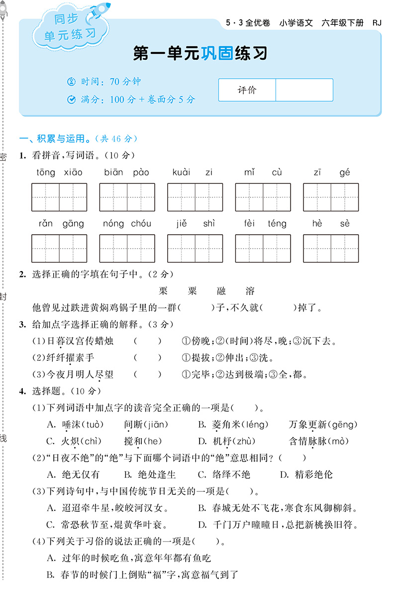 首页> 小学教辅> 六年级> 语文> 2022春 5.3全优卷六年语文下册