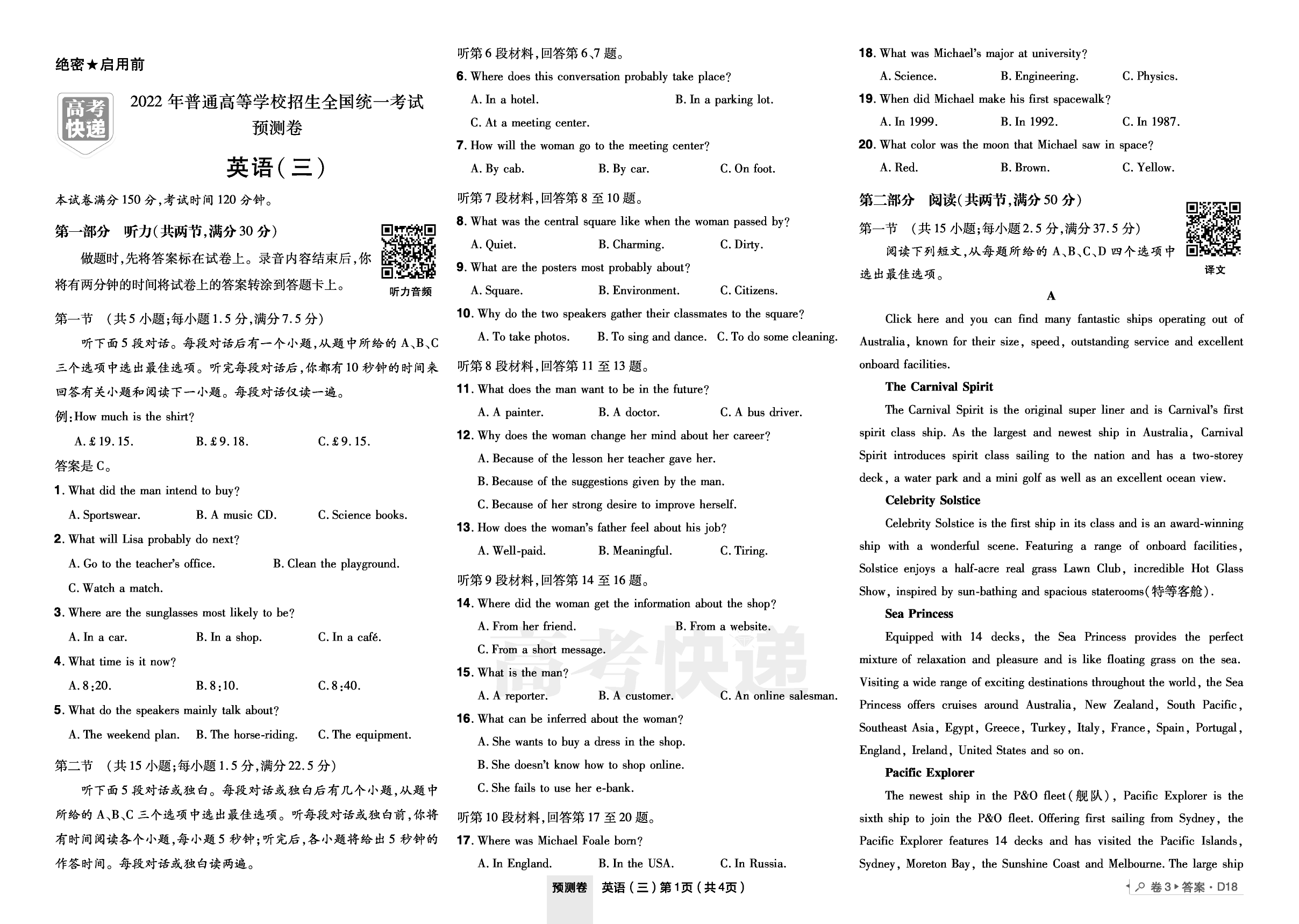 2022新版高考快递高考预测卷8套英语 新高考专用