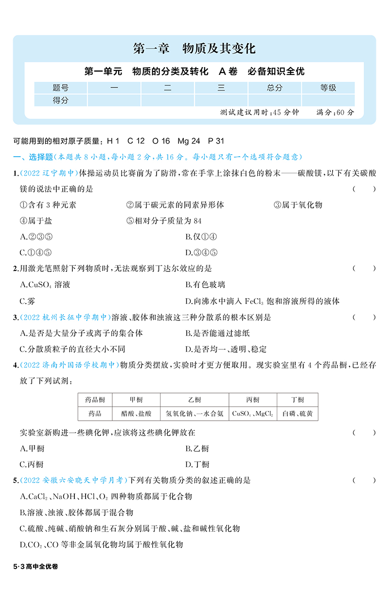 首页> 高中教辅> 高一年级> 化学> 2023版 5.3全优卷化学必修第一册