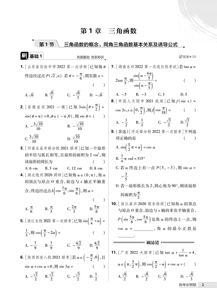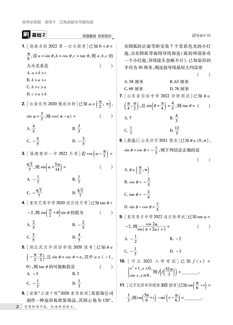 2023版高考必刷题 专题突破 数学2 三角函数与平面向量