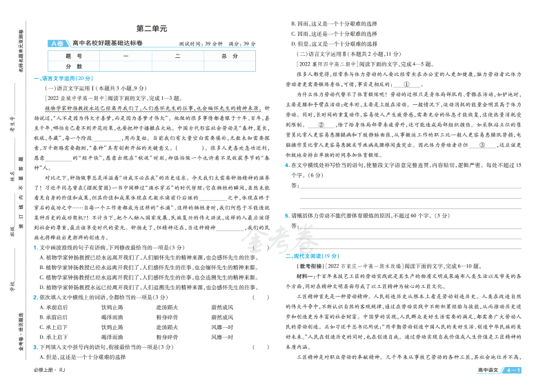 2023版金考卷活页题选 名师名题单元双测卷 高中语文 必修上册 人教版