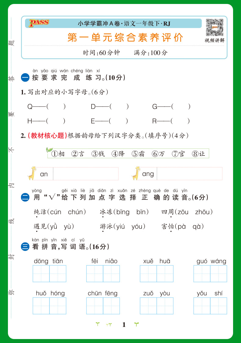 2023春季 pass绿卡图书 小学学霸冲A卷语文 一年级下 人教版 全彩手绘