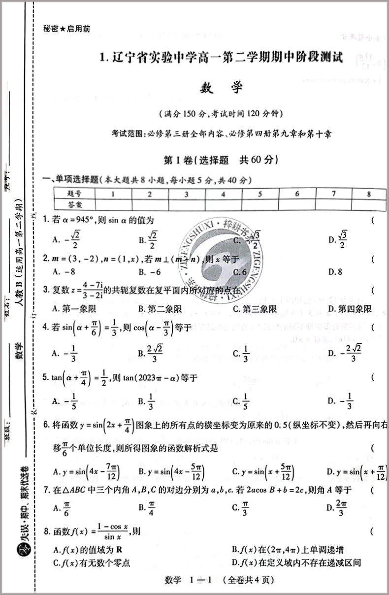 2023版 零失误期中期末优选卷 数学高一第二学期人教B版